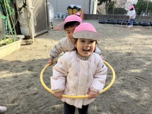 園庭で2人組になってフラフープの中に入り、 「電車ごっこをしているの!」と元気な声がしました。 「左のドアが開きます。次...2026.1.30