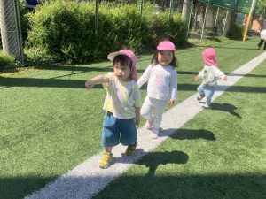 白線の上で電車ごっこ