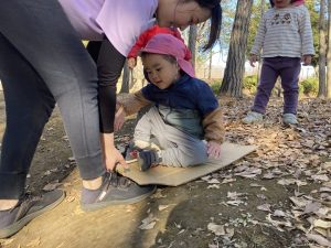 新しい公園は斜面があり、そこを「3.2.1!」と言葉にしながら下りて行ったり、段ボールのソリで滑っていったりするのがブームです!