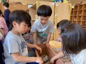 「野菜ってどうやって育てるの?何が必要なの?」と保育者が聞いてみると「う~ん…」と考える姿が見られました。すると、年長のお友だちが「種だよ!」「あと土!」「土入れたら苗をそこに入れて」と次から次へと教えてくれました!