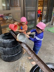 砂場でダムを作ったり、雨どいから水を流して船を流したり、五感を刺激しながら活動に取り組みました!