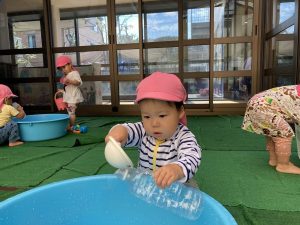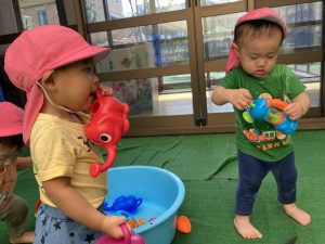 玩具を組み合わせて水を移し替え集中して遊び込むふじ組の子どもたち!