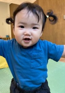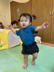 お名前を呼ぶと、いちに、いちに、と両手を広げてバランスを取り、歩いて保育者の所へ向かうお友だちです!