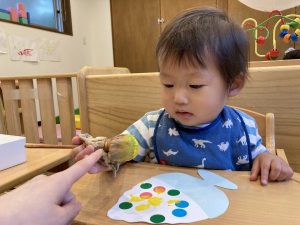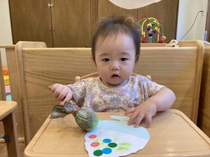 最初はかき氷の型を保育者がおさえていましたが、自分でおさえてスタンプする姿も見られました♪ すごいね!!