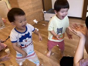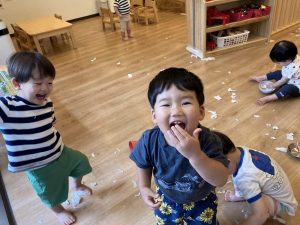 千切ったものを『ふぅ~』と吹いたりと素材ならではの遊びを楽しんでいました。