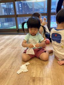 千切ったものを『ふぅ~』と吹いたりと素材ならではの遊びを楽しんでいました。