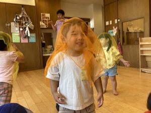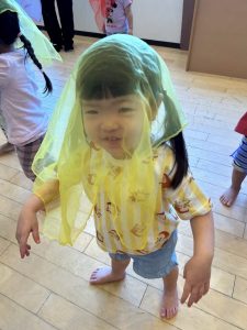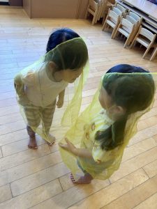 スカーフを配ると「同じ色だね」と嬉しそうにしたり「見て!お化けだよ」と早々に変身する子どもたち☆