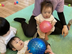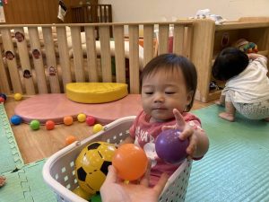 保育者や友だちと一緒に全身を使ってボールを追いかけたり、手先を使ってボールを掴んだり、投げたりして楽しく遊びました♡