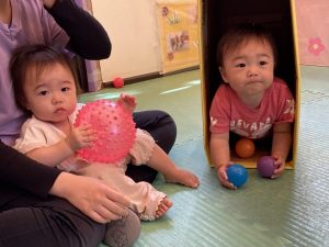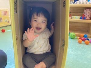 ボールが入っていた箱やかごに入って楽しむ姿も見られました!!箱の中を覗いて友だちといないいないばあっ!を楽しむ姿も…!!