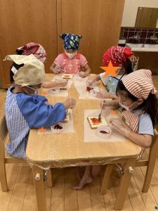 午前中、お散歩に行く前に「ピザトーストを自分たちで作るよ」と伝えると、