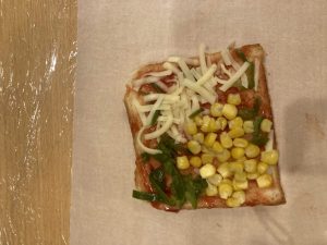 午前中、お散歩に行く前に「ピザトーストを自分たちで作るよ」と伝えると、