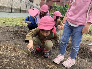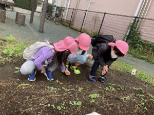 畑に着くと「あ!芽が出てるよ」「こっちとこっちで少し色が違う」などと