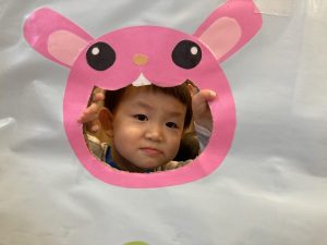 「うさぎさんどうぞ!」「もぐもぐ」と言いながらボールやおにぎりを入れていました。