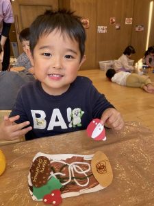 のりの量に気をつけながら、「どこに貼ろうかな?」「ここに貼っていい?」と楽しそうにケーキを飾り付けて素敵なブッシュドノエルが出来ました♪