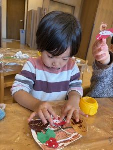 のりの量に気をつけながら、「どこに貼ろうかな?」「ここに貼っていい?」と楽しそうにケーキを飾り付けて素敵なブッシュドノエルが出来ました♪
