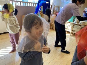 スカーフをマスクに見立てて色んなマスクを作りながら歌いました(*^-^*)
