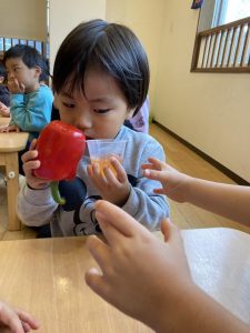 実際の野菜のにおいと嗅ぎ比べて見たり、色を観察したりと夢中になっていましたよ(^^)