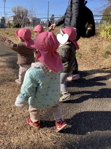 保育園を出発する前に保育者が「出発します!えいえいおー!」と言うと、子どもたちも保育者に続いて「お~!!!」と言う姿が見られました♪