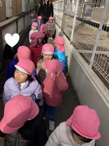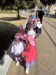 前を見て車や自転車に気をつけながら鳥や咲いている花を見つけ、お友だちと共有し合ったりして仲良く楽しくお散歩に行っています♪