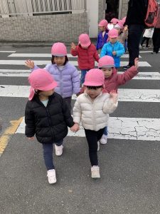 しっかり手を上げて「渡ります!」の合図をしたりして交通ルールも自分たちで意識できる事が増えました!