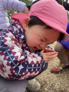 散歩先では「むっくりくまさん」や「オオカミさん今何時?」などの集団遊びが大好きで、最近は保育者だけでなくお友だちもクマさんやオオカミさんになって追いかける役を楽しんでいますよ☆