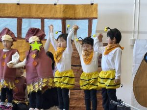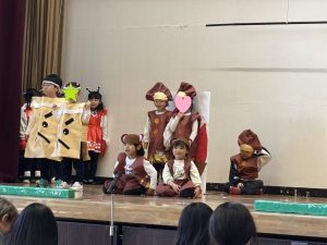 3歳児クラスは、 三びきのやぎのがらがらどん を題材にしたオペレッタを披露しました。 小さなやぎ・中くらいのやぎ・大きなやぎになりきり、可愛らしく、怖いトロルも出てきて 「トロルだぞー!」と元気いっぱいに表現する姿もみられました。緊張しながらも舞台に立ち、友だちと一緒に最後までやり遂げた子どもたち。 大きな拍手をもらい、嬉しそうな笑顔が印象的でした☆