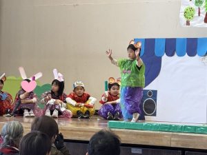 3歳児クラスは、 三びきのやぎのがらがらどん を題材にしたオペレッタを披露しました。 小さなやぎ・中くらいのやぎ・大きなやぎになりきり、可愛らしく、怖いトロルも出てきて 「トロルだぞー!」と元気いっぱいに表現する姿もみられました。緊張しながらも舞台に立ち、友だちと一緒に最後までやり遂げた子どもたち。 大きな拍手をもらい、嬉しそうな笑顔が印象的でした☆