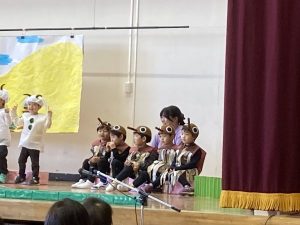 5歳児は、子どもたちと一緒に作り上げたオリジナル劇 「森のフェスティバル」を発表しました。 ストーリーやセリフ、踊りなどをみんなで話し合いながら作り上げ、 友だちと協力し合う姿に大きな成長を感じました。 一人ひとりが自分の役に責任をもち、堂々と表現する姿はとても頼もしく、 さすが年長さんだなと感じる発表でした☆