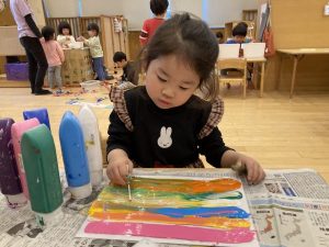 初めは好きな色の絵の具を垂らして絵の具を広げるところから!