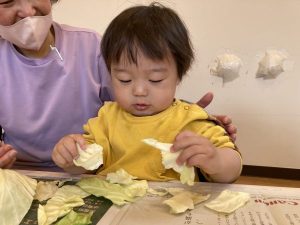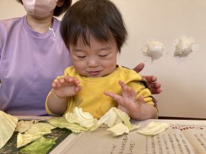 保育者と一緒にキャベツに触れてパッキンと割ることに挑戦!