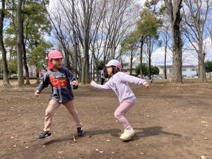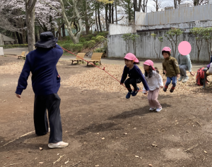 ばら組の子どもたちがサッカーや、大縄跳びを始めると「どうやってやるの?」「一緒にいーれーて!」とひまわり組の子どもたちも駆け寄って行きます。
