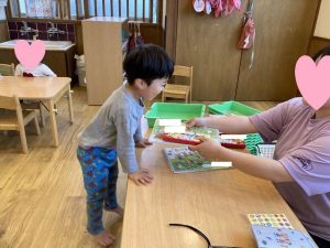 幼児になったらもらえる個人持ちの自由画帳とクレヨン、お道具箱、シール帳などをもらうと進級した実感をより感じたようで、お友だちと「もうたんぽぽ組だもんね!」と話す微笑ましい姿がありました(*^^*)