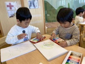 「何描いてるの?見て見てー!」とお友だちと話をしながら、じっくり描いていましたよ♪