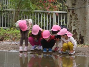 大きな水たまりを見つけてみんなで観察していました!
