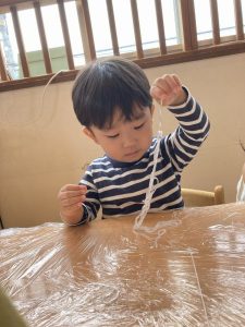 「なにこれ?」「ながーいね」「なんか四角の形してる」と、触ったり匂いを嗅いだりを楽しむ子ども達。