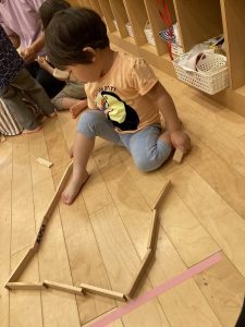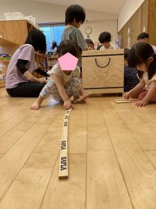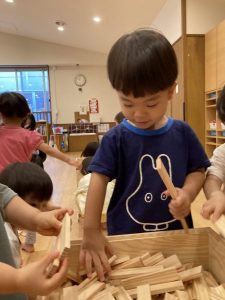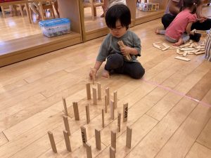 それぞれ集中し積み上げたり並べたりする子ども達。