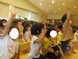 クイズの答えを考え、元気いっぱい手をあげる子どもたち♡