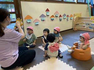 「いただきます」で手を合わせる事がだいぶ定着し始めたすみれ組。
