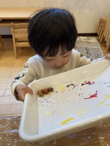 どんぐりに絵の具をつけて箱の中で転がせました。