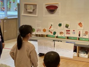 食材カードをそれぞれのお皿に貼っていきました。