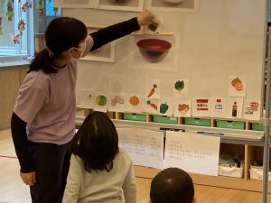 今日は食育を行いました。今日の給食のメニューにはどんな食材が使われているか、考えながら