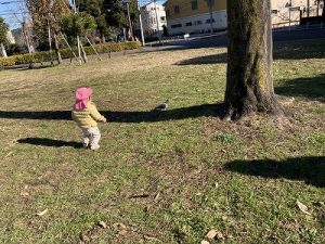 たくさんの鳩が広場内に飛んでくると夢中になって追いかけ、