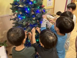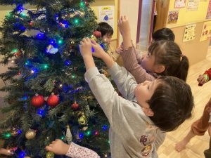 玄関のツリーの飾りつけをあかぐみのみんなでお手伝いしてくれました♪