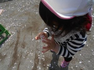 まるでピンクの絨毯のように一面に広がった桜の花びら♪ ぽかぽか陽気も気持ちいい一日でした。 たくさんの花びらの中からお花の形のまま落ちている桜を見つける一歳児のお友だち。 「あった!」と言いながら宝探しのように楽しんでいました♪
