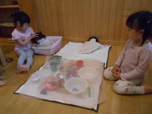 そう言ってお口にお手玉を乗せるお友だち もう一個のお手玉はおでこに・・・ どうやらお熱が出ているみたいです。 優しく看病する姿にほっこりしました。 その横ではご飯の準備が オーガンジーの布の下にあるのは 「お寿司!」だそうですよ♪