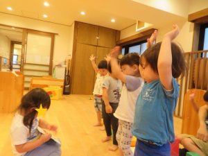 〇〇ちゃん先生の真似をして、手遊びをする子ども達。
