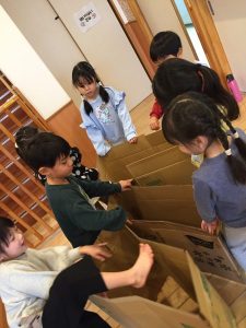 まだみんなが乗る大きさには足りないので、事務の先生に「段ボールを取っておいてください!」とみんなでお願いし、嬉しそうに保育室に運んでいました。