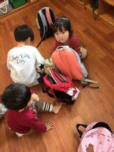 リュックでの登園にも慣れ、お気に入りのリュックから着替えやコップなどを出し朝の支度を張り切って行う姿が見られます😊