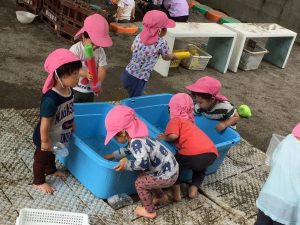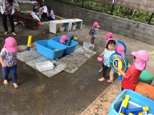 園庭でいつもと違う水遊びが出来ると知り、乳児クラスの子も早速色んな水遊び玩具に触れ始めました。