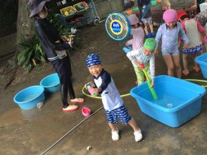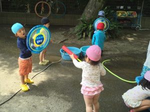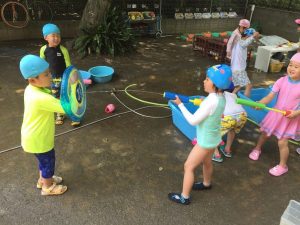 園庭で水鉄砲戦争が繰り広げられ、敵になったり味方になったり大はしゃぎ。